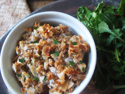 Preheat oven to 425 degrees. In a non-stick pan over medium heat, toast the shredded coconut until slightly golden and then set aside. In a small bowl, combine coconut oil, lemon juice, parsley, breadcrumbs, salt, egg white, and shredded coconut. Stir until combined. (Note: coconut oil is solid at room temperature, so you can soften it first with a spoon or quickly warm it in the microwave.)